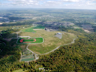 Pioneer Coal mine in Stellarton. Reclaimed areas, with water tower and track field in the foreground, current mine operations in the background.
