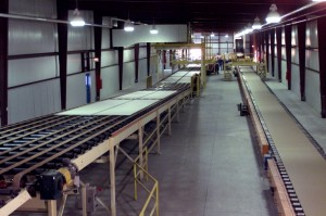 To produce wallboard, calcined gypsum is mixed with water and additives to form a slurry which is fed between continuous layers of paper on a board machine. As the board moves down a conveyer line, the calcium sulfate recrystallizes or rehydrates, reverting to its original rock state. The paper becomes chemically and mechanically bonded to the core. The board is then cut to length and conveyed through dryers to remove any free moisture.